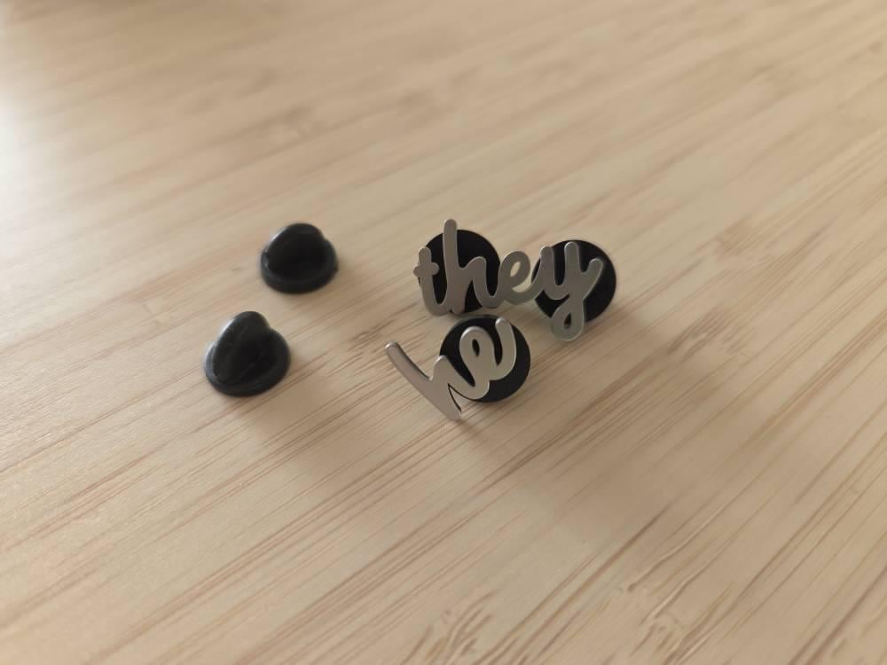 Unlike many other pronoun accessories, these are designed to be flexibly mix-and-matched to pick any 2 pronouns to form your preferred pairs — making lots of combinations and permutations possible.