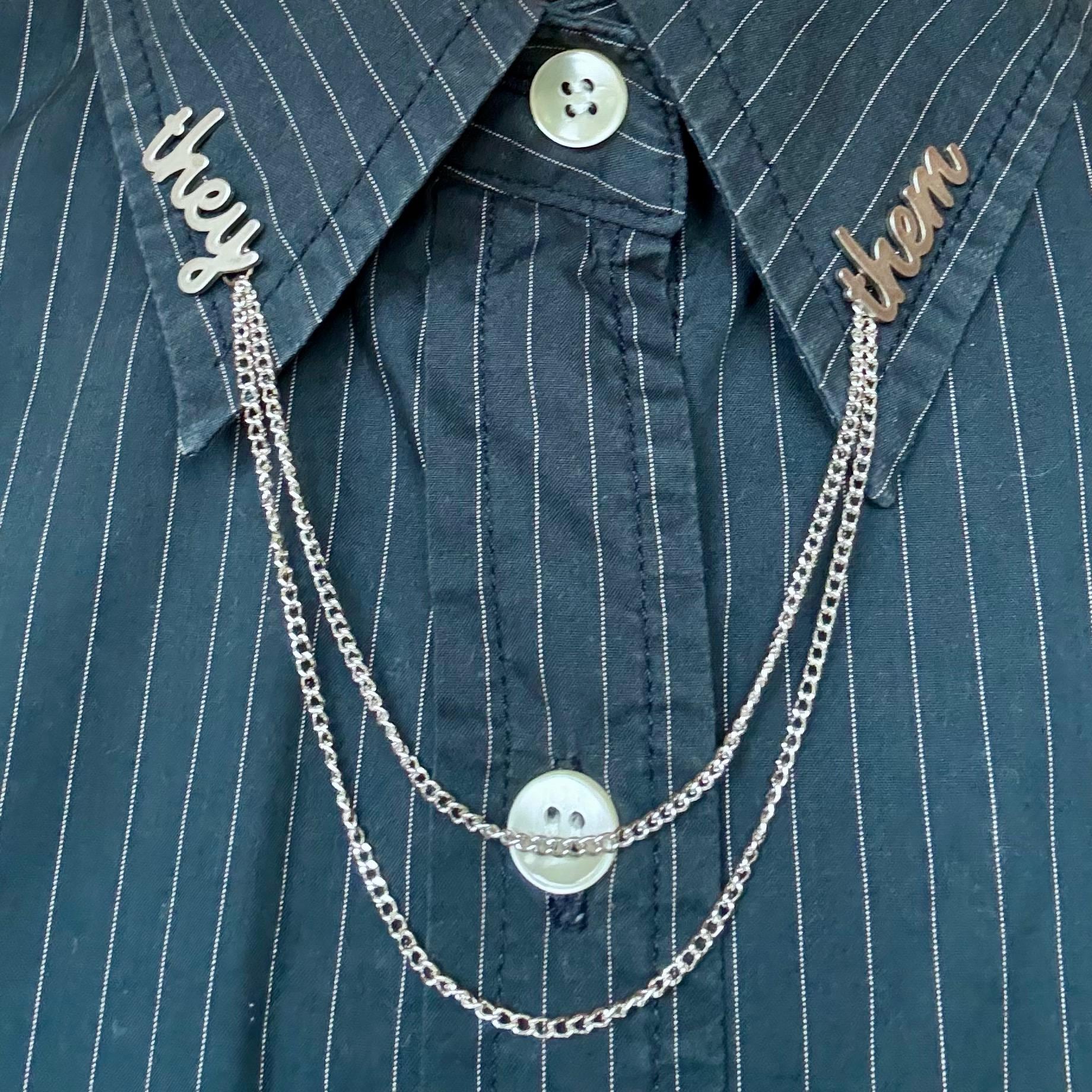 The Pronoun Pin Badges can also be upgraded to be worn with connecting chains! Instant fancy style points. I'm all about flexible design, and these chains are super easy to detach — allowing you to swap between wearing the pins as linked pairs, or as separate pins.